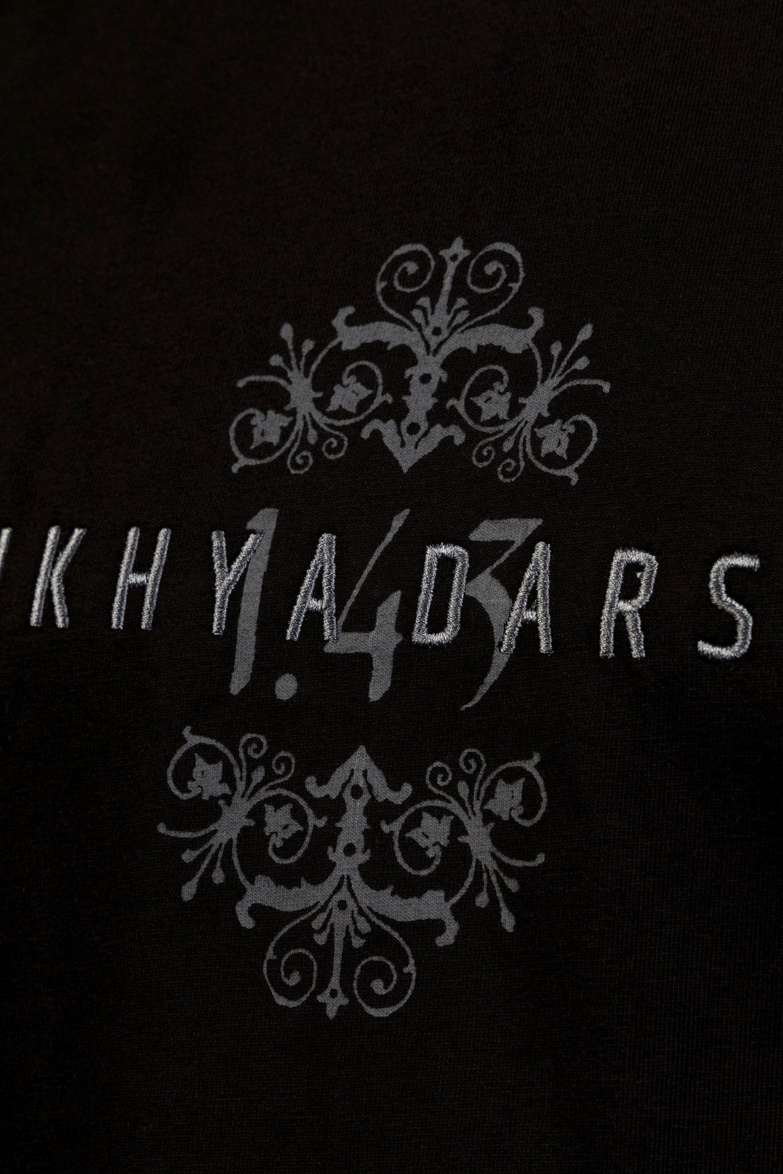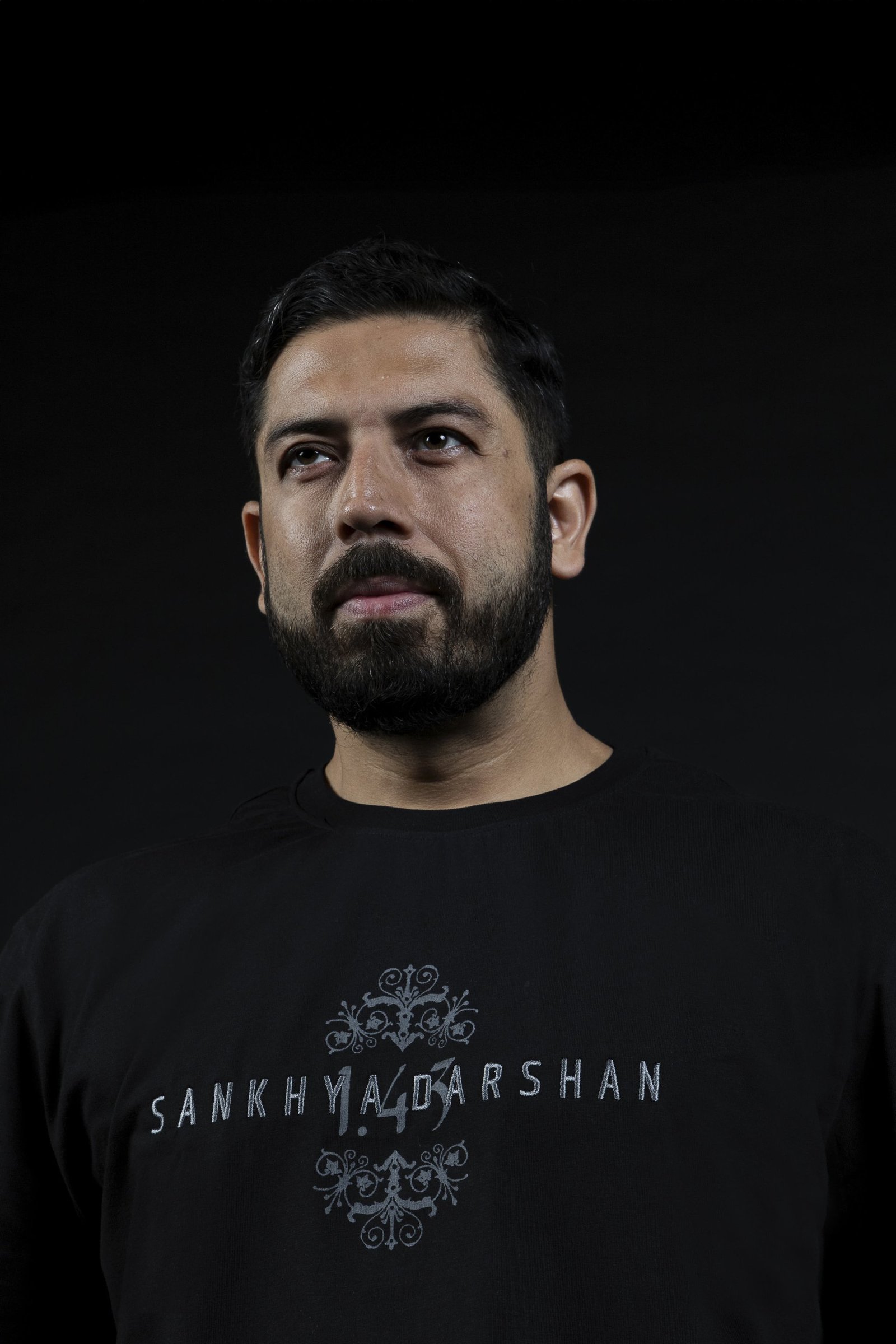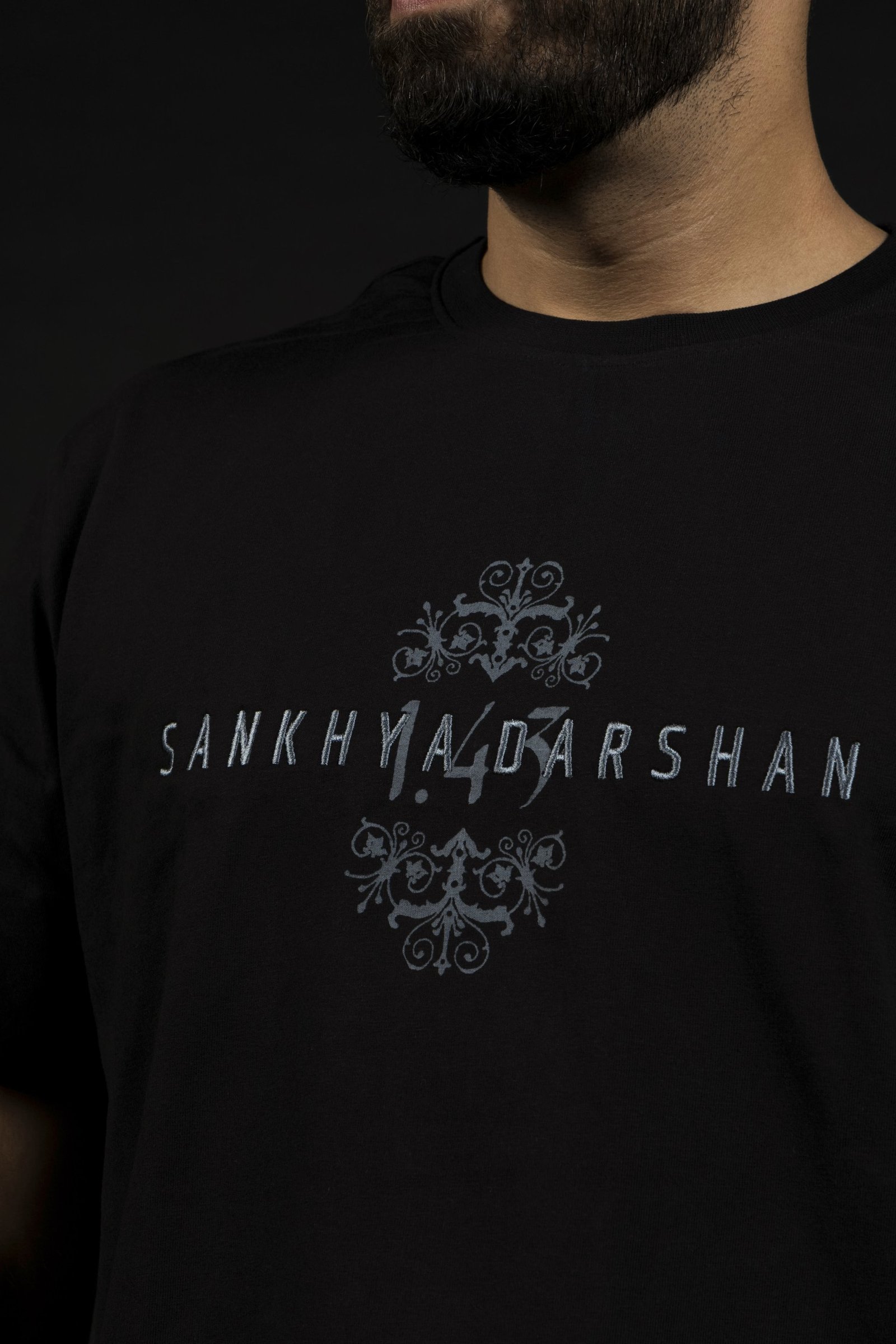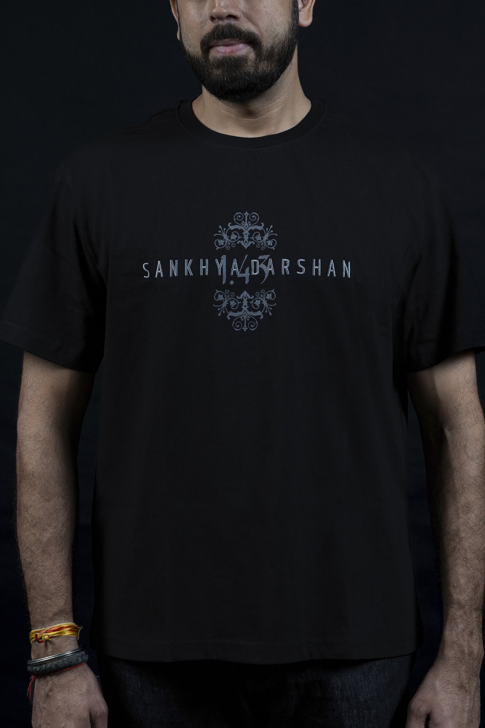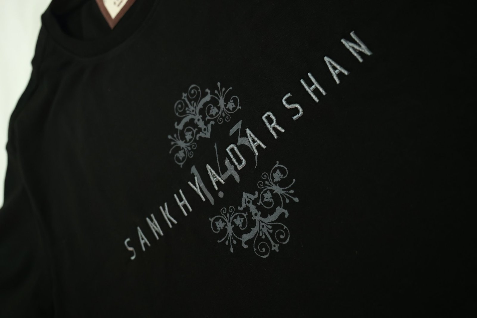 On the front, a smaller mandala embroidery continues from the back, symbolizing the ongoing flow of cosmic energy and spiritual continuity. Instead of branding, the front carries a respectful homage—the words “Sankhya Darshan” with the shlok reference number embroidered below, reflecting deep admiration and personal resonance with this ancient philosophy.