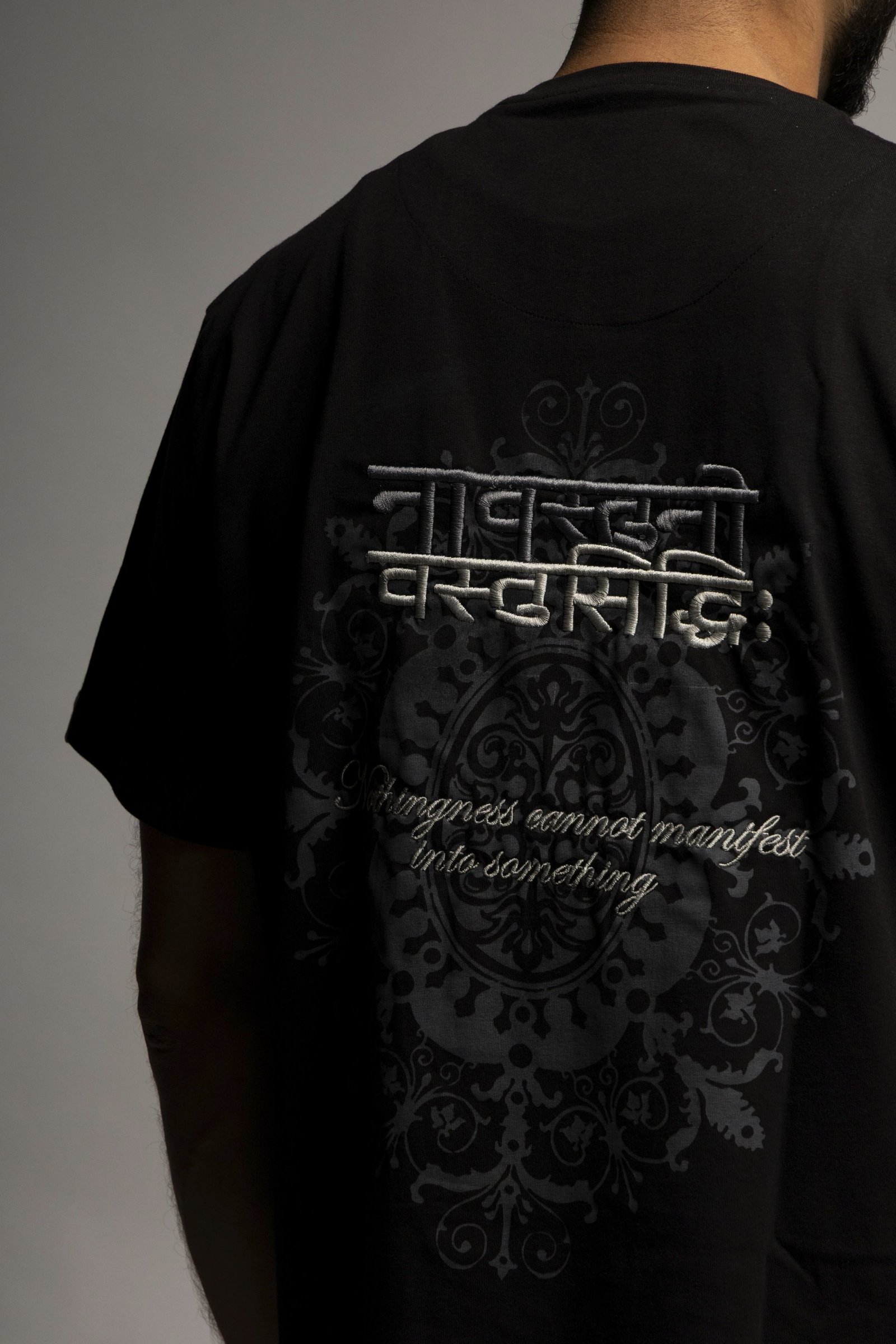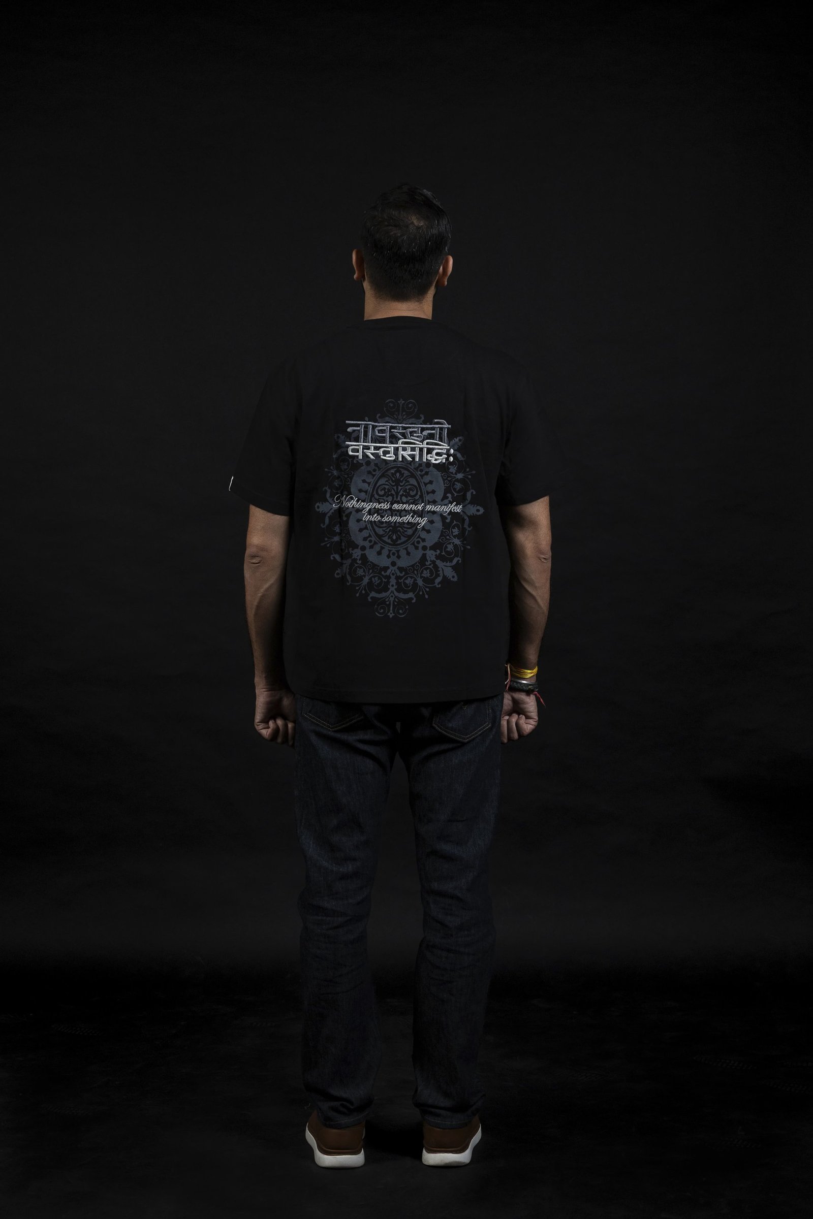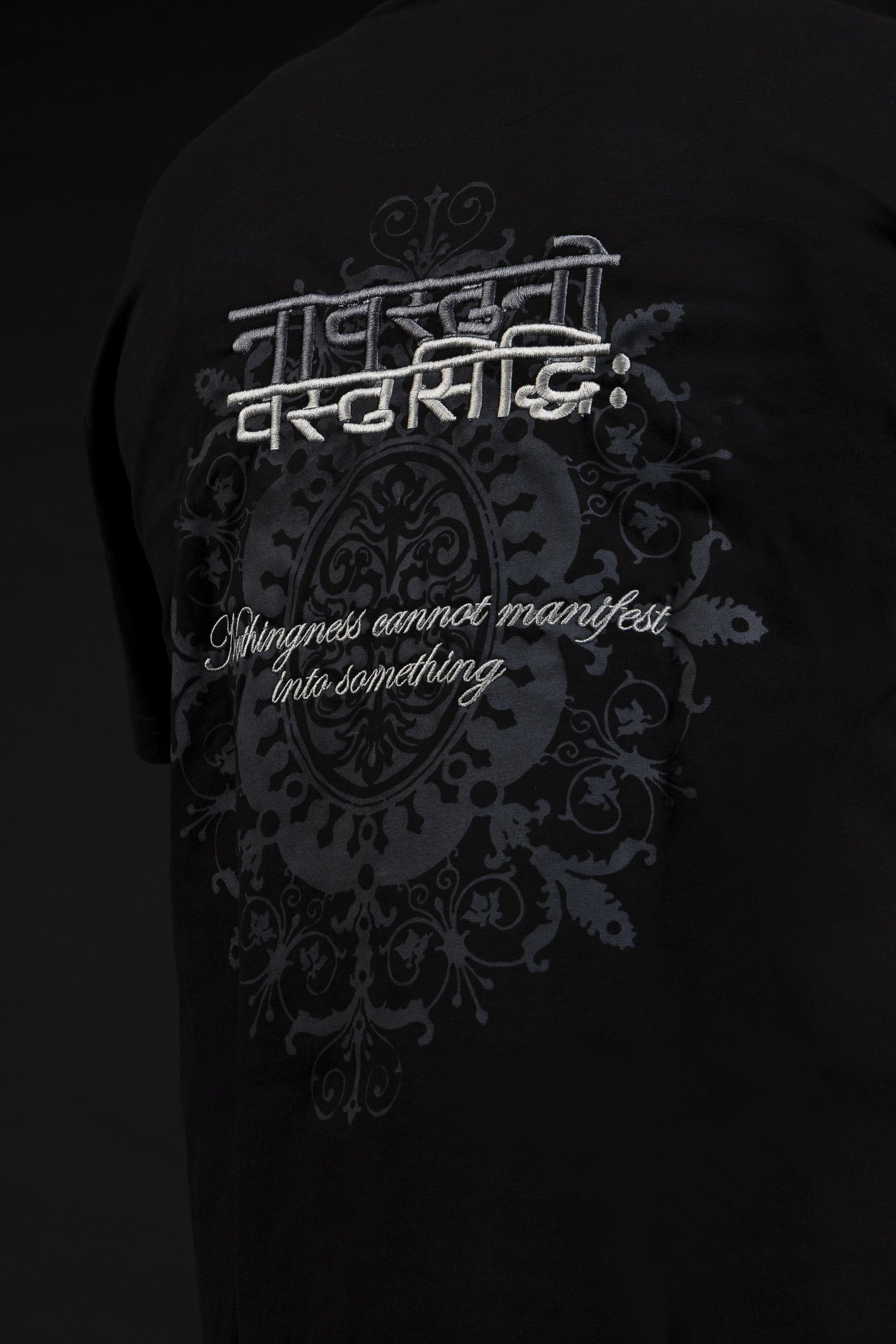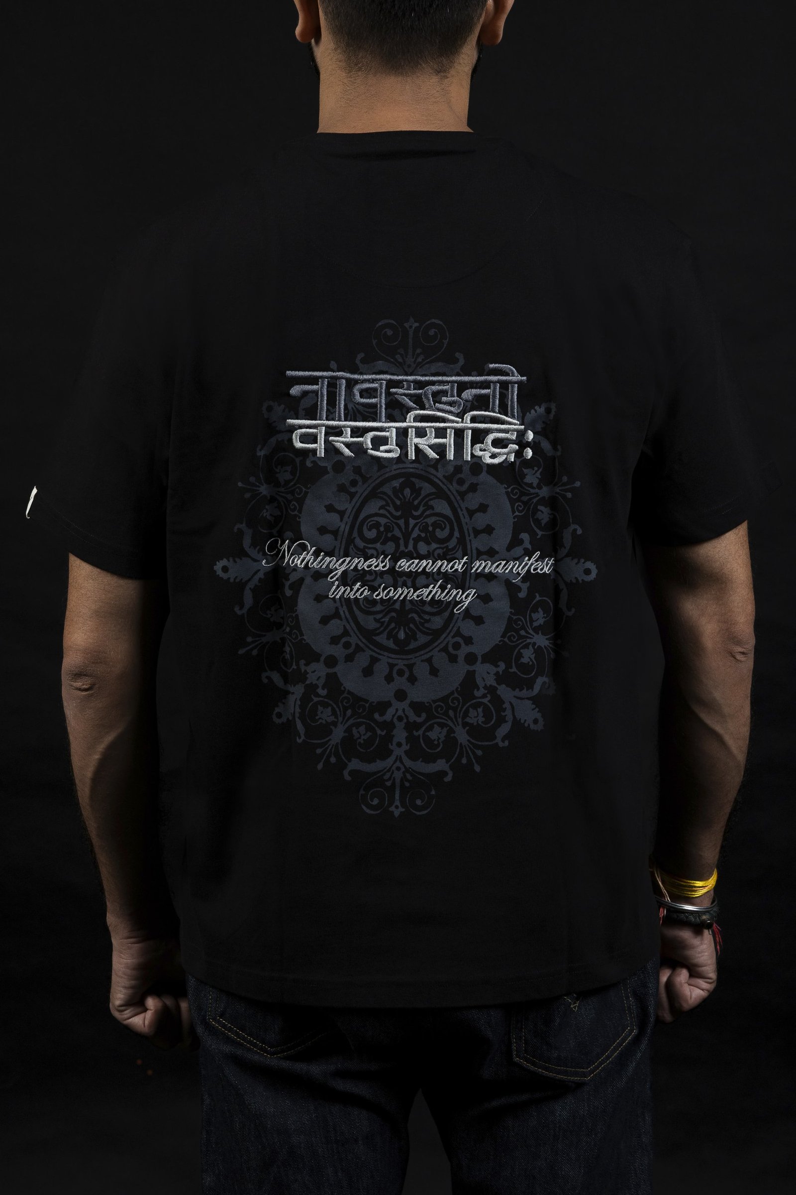 The striking design features a large mandala on the back representing the ever-expanding cosmos. Though vast and infinite, the cosmos begins with a single point—a “nāva”—signifying the origin of all creation. Overlaid is the embroidered shlok नावस्तुनो वास्तुसिद्धिः along with its profound meaning: “Nothingness cannot manifest into something.” This truth anchors the design in timeless philosophy.